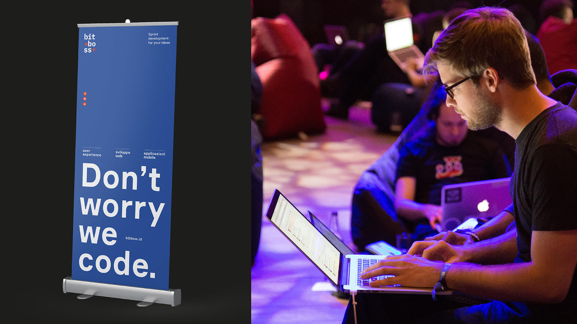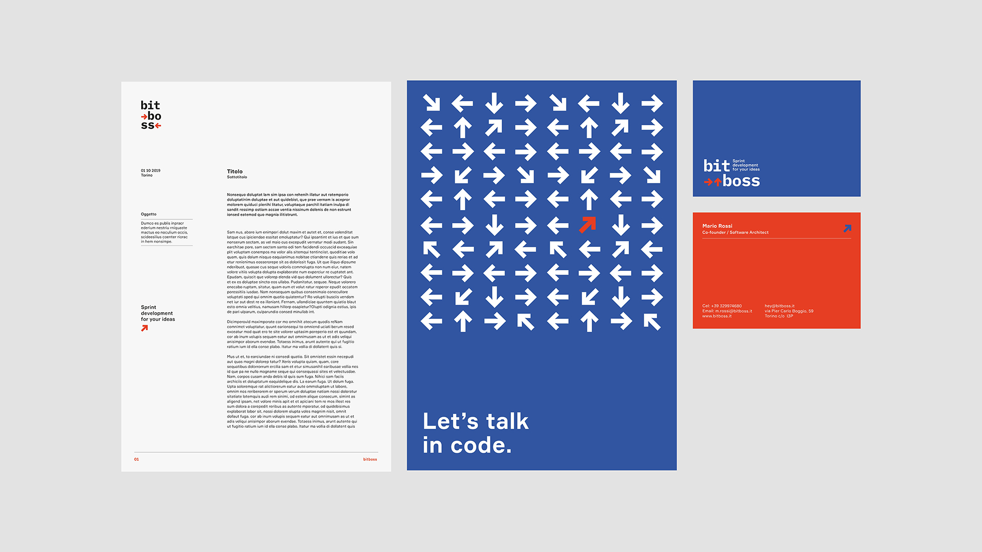Per Bitboss abbiamo creato un’identità visiva che rappresentasse meglio il loro core business e li identificasse subito come software house. Abbiamo dunque stravolto il brand cambiando totalmente il concept e definendo una palette colori che richiamasse il mondo tech.
