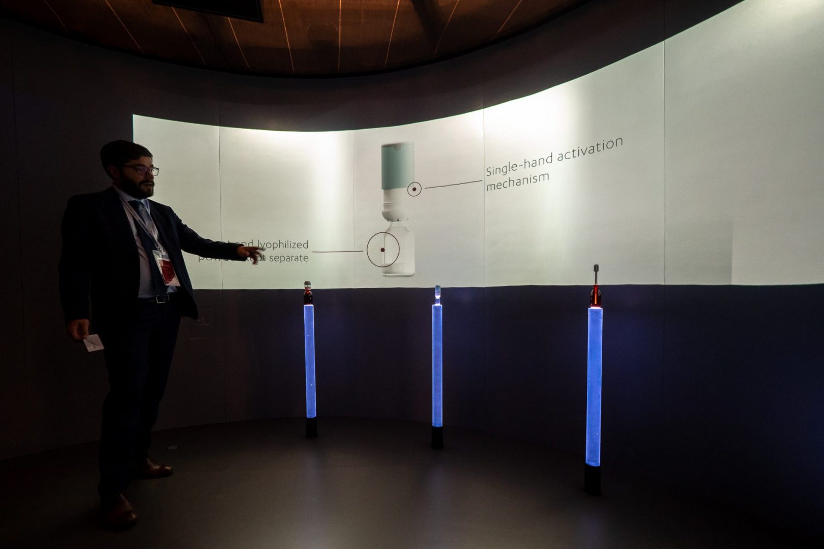 L’esperienza della dark room si compone di tre momenti di engagement: all’entrata si attivano dei video che inquadrano uno specifico contesto (dall’invecchiamento della popolazione all’urgenza di ridurre l’inquinamento ambientale), quindi l’utente appoggiando la card RFID attiva la risposta di Bormioli: un prototipo sviluppato dalla divisione di ricerca e sviluppo. Visti tutti i video di soluzione si attiva in automatico una proiezione immersiva a 360° che anticipa l’accensione delle luci e la visualizzazione dei prototipi sui piedistalli illuminati.