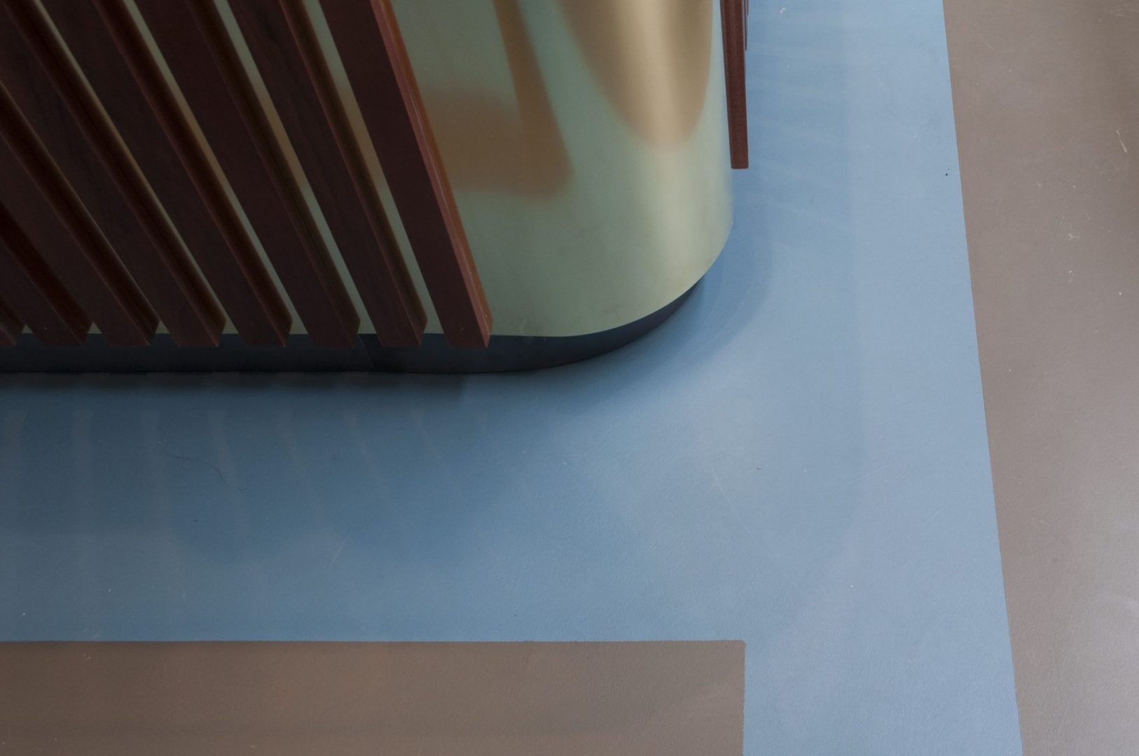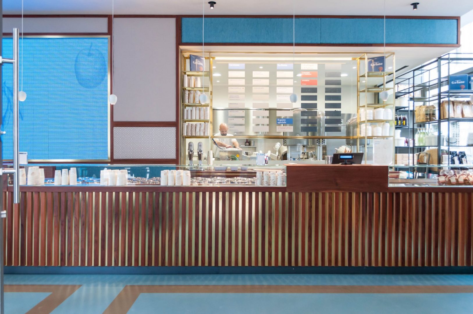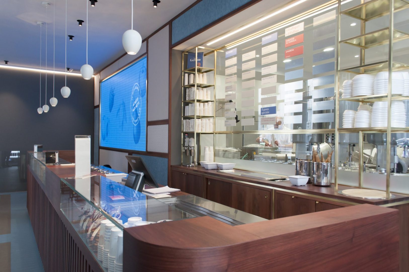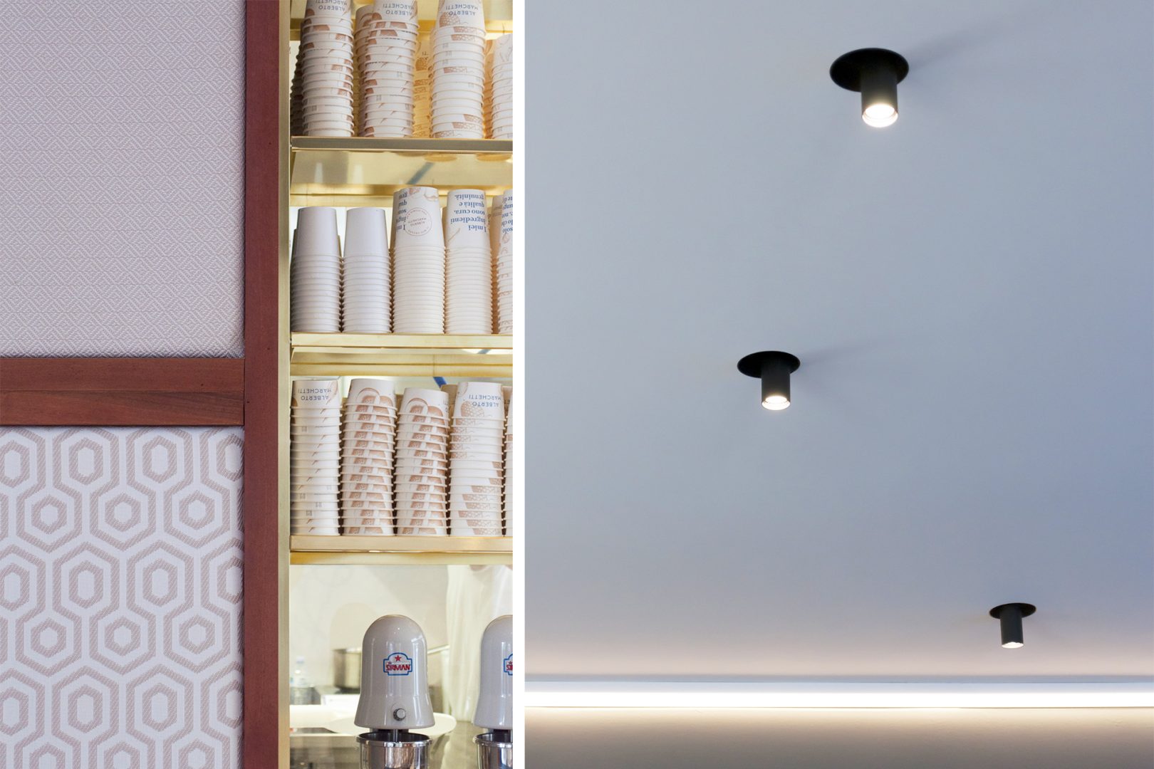 Il protagonista dello spazio è il bancone. Disposto frontalmente rispetto alla clientela è un elemento d’arredo imponente, caratterizzato da listelli alternati in ottone e legno noce nazionale. Gli angoli stondati ne ammorbidiscono la presenza ed aiutano la gestione del flusso di persone. La parete dietro il bancone vuole richiamare una quinta scenica. Attraverso tessuti geometrici che incorniciano un grande ledwall e una vetrata che mostra tutti i gusti del gelato nasconde la vista sul laboratorio.