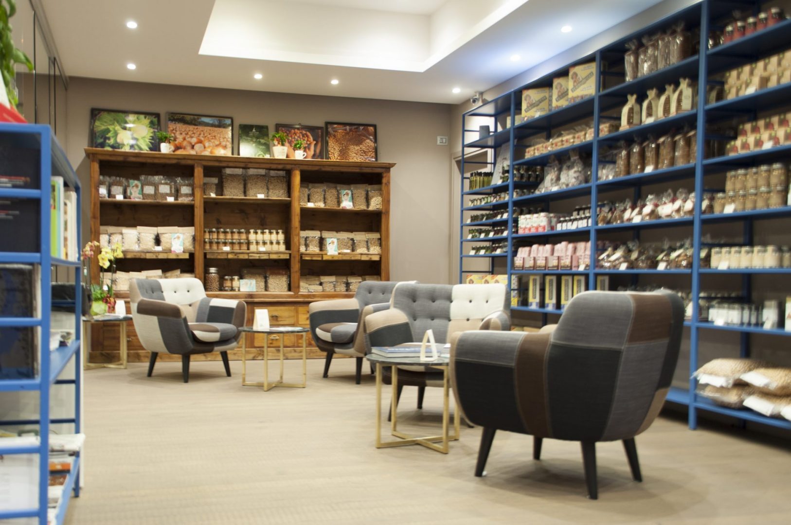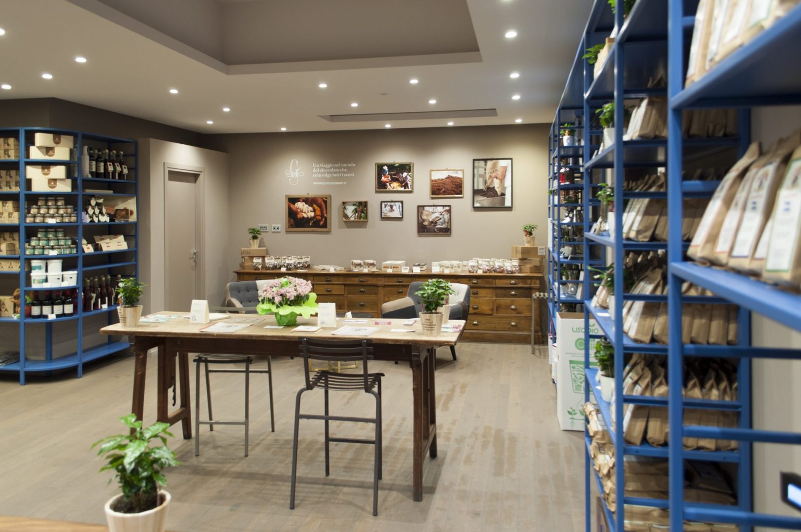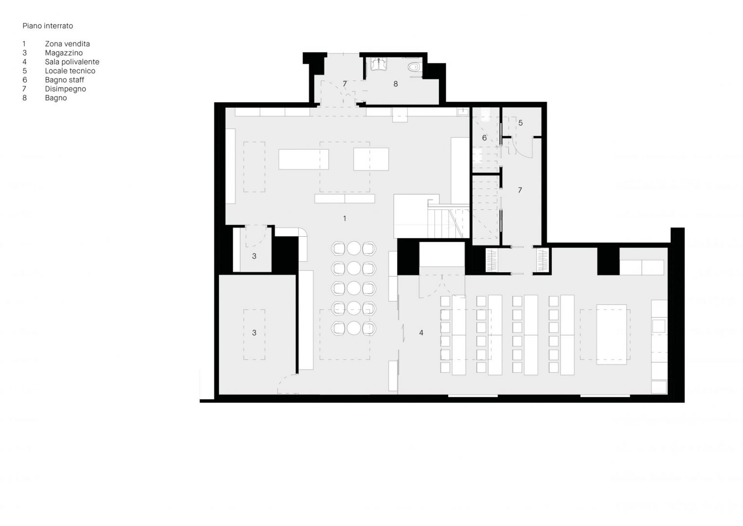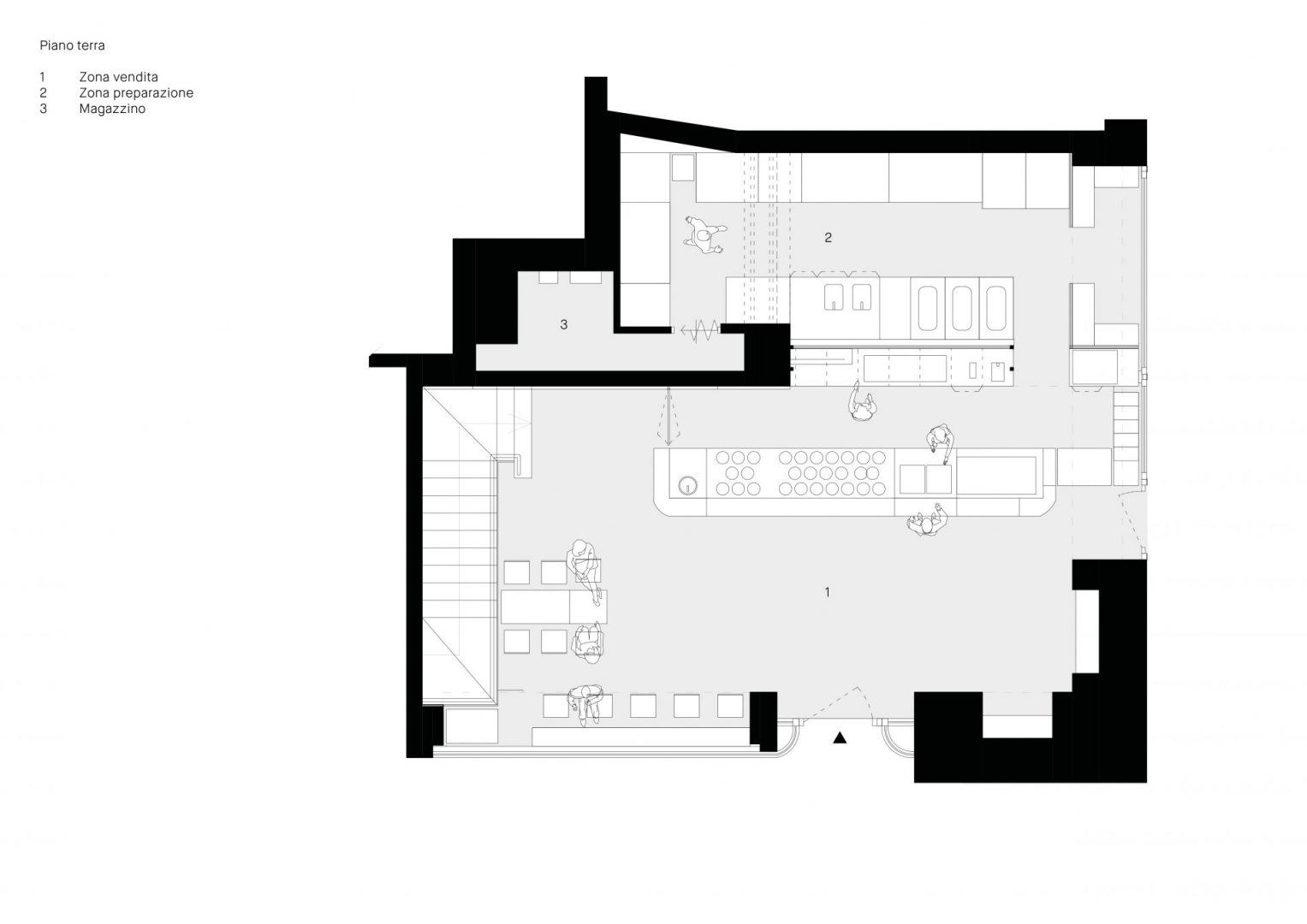 Al primo piano si trovano il laboratorio ed il magazzino, entrambi a vista. Il primo è visibile da una grande vetrata interna, il secondo è completamente esposto su strada attraverso la vetrina. Nello shop, al piano interrato, vi sono dei corner dedicati, un’accurata selezione di prodotti di alta qualità che Alberto utilizza per produrre il suo gelato. Un modo per raccontare come funziona l’intera filiera del gelato e permettere alle persone di apprendere grazie ad uno spazio dedicato ai corsi.