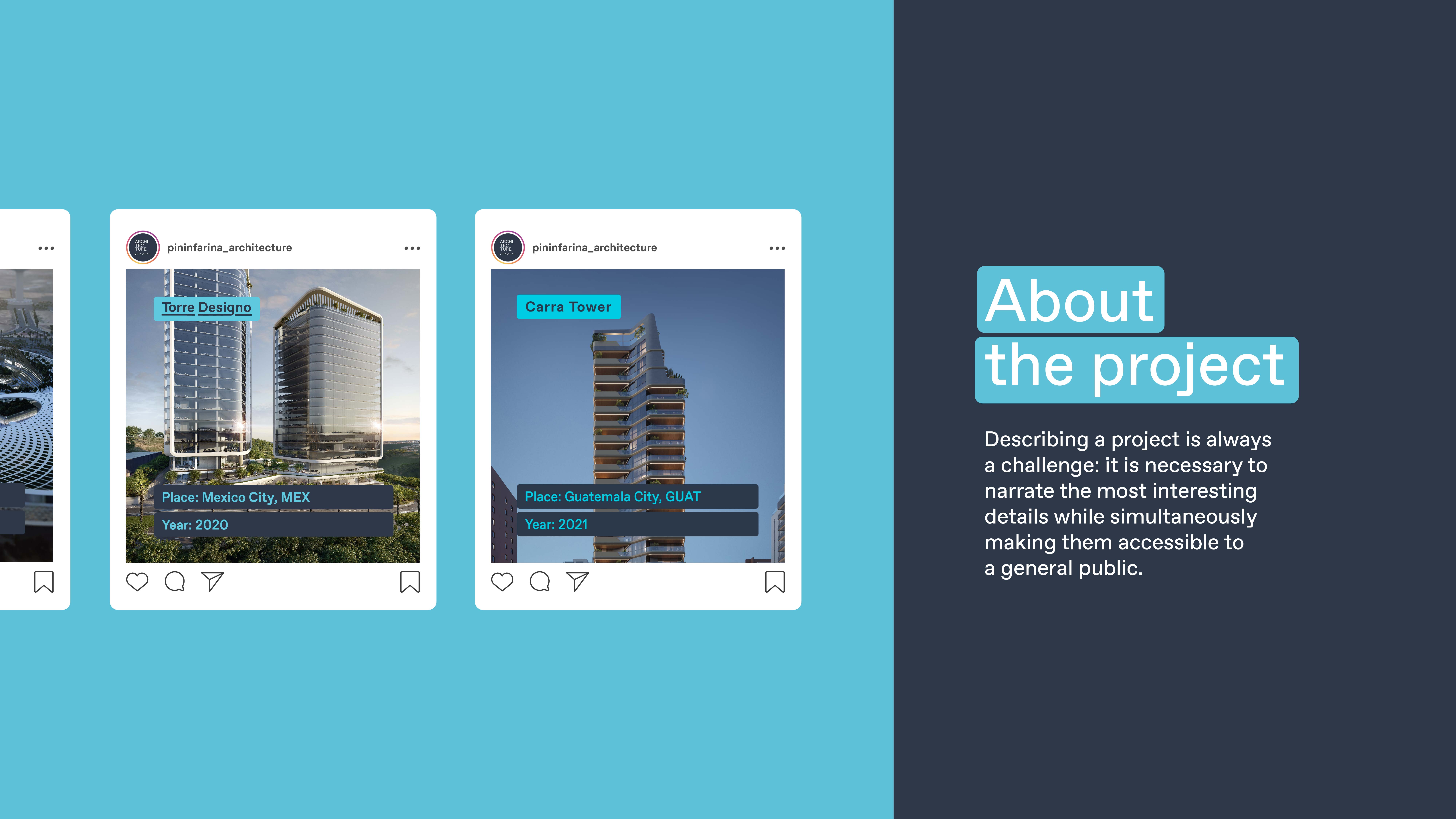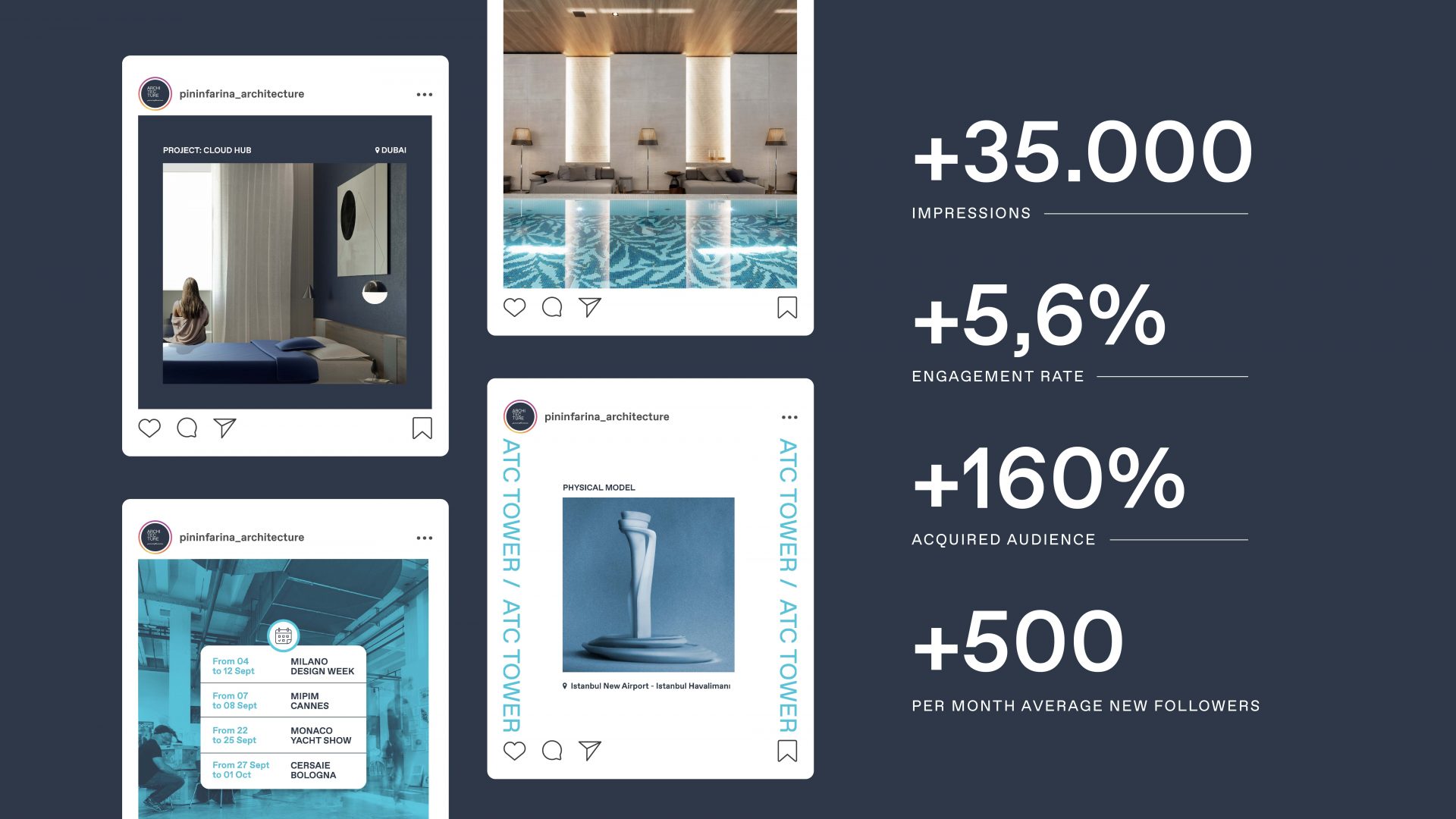 but also for a rigorous and methodological approach to design, proven by the expertise gained over the years in this industrial sector. For Pininfarina Architecture we created a digital strategy dedicated to Instagram, in order to create a visual identity for this social network and to narrate the projects and more.