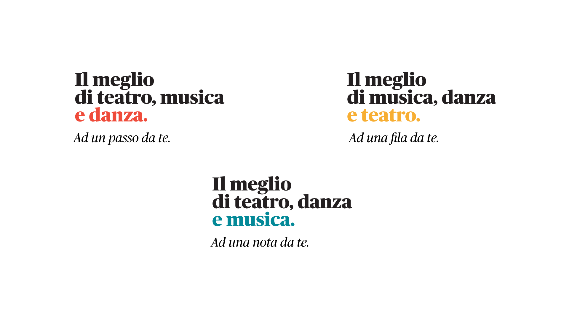 The wide selection of shows offered and the accessibility to the events are communicated through the slogan “The best of theatre, music, and dance in a step away from you”, translated, in terms of photography, in a multiple subject campaign.