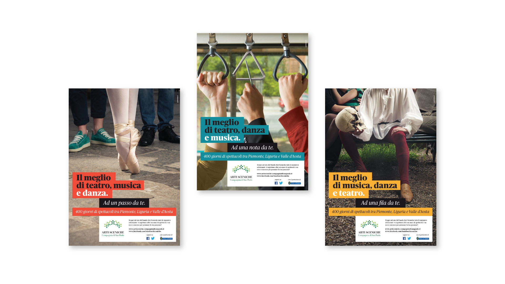 Arti Sceniche is a project realized by Compagnia di San Paolo, who finances the best performing arts initiatives in Piemonte, Liguria and Valle d’Aosta, Italy. The strategic communication campaign is based on the slogan “il meglio di teatro, musica e danza ad un passo da te”, which is used from manifestos to cards, and within social media through a photographic contest.