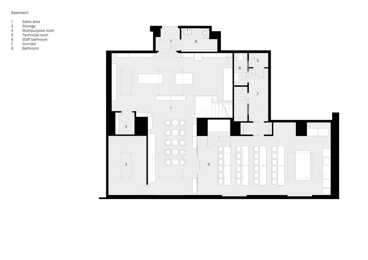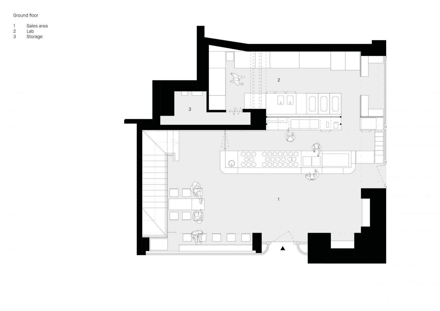 The flooring in concrete with its pattern, reminds the pavement of the outside’s arcade in a way to offer a sense of continuity between inside and outside, the shop and the city.