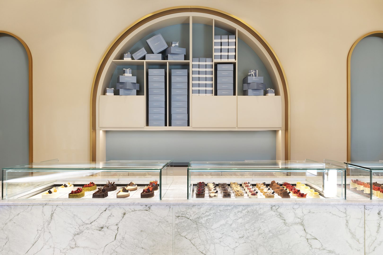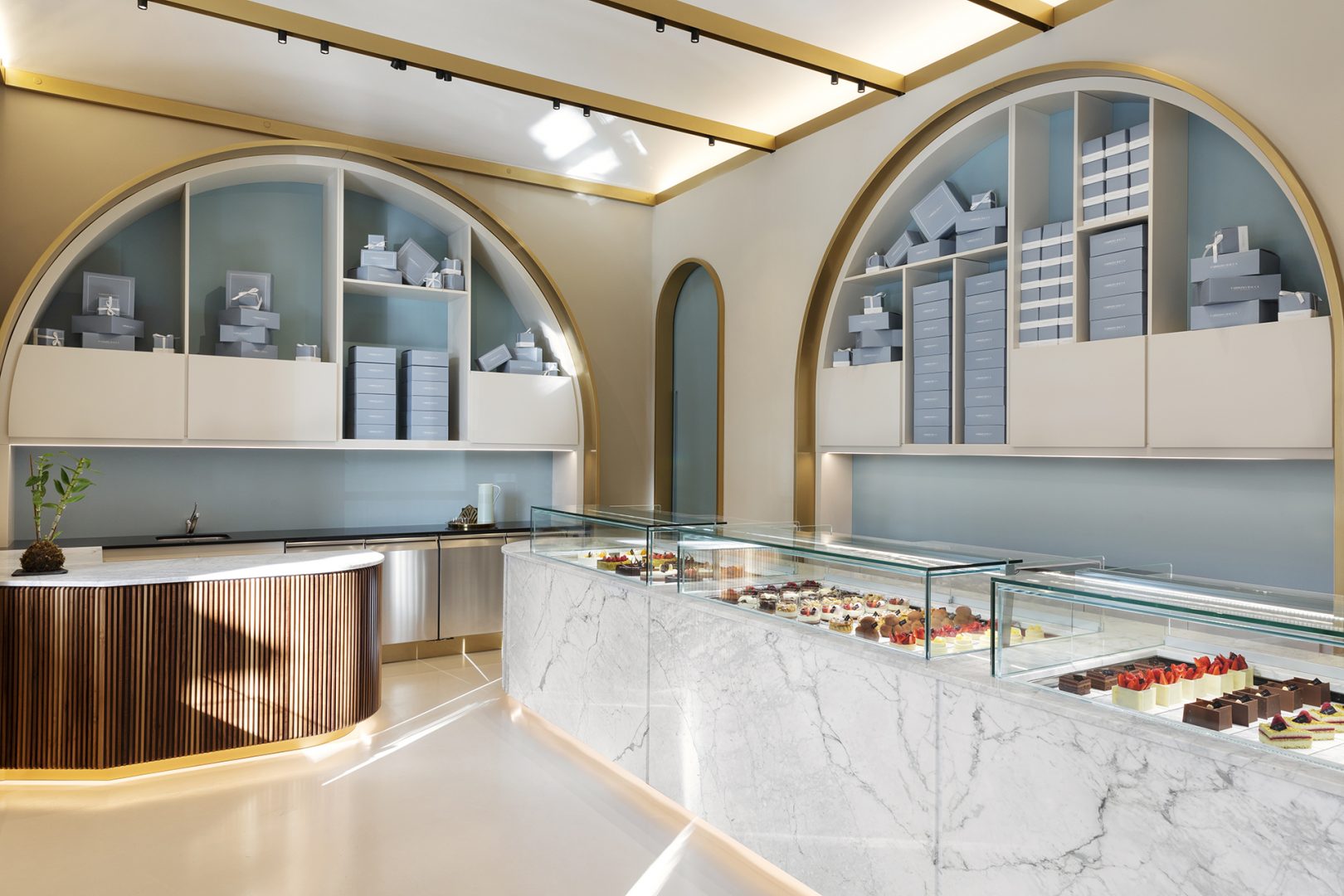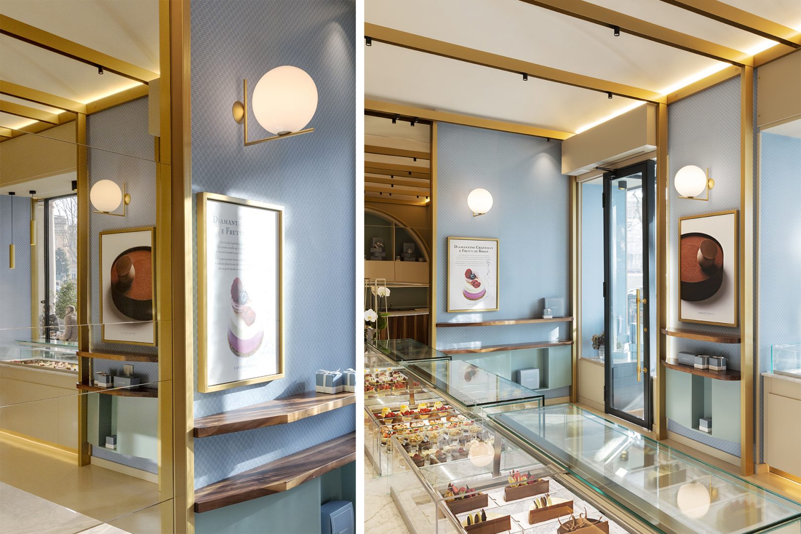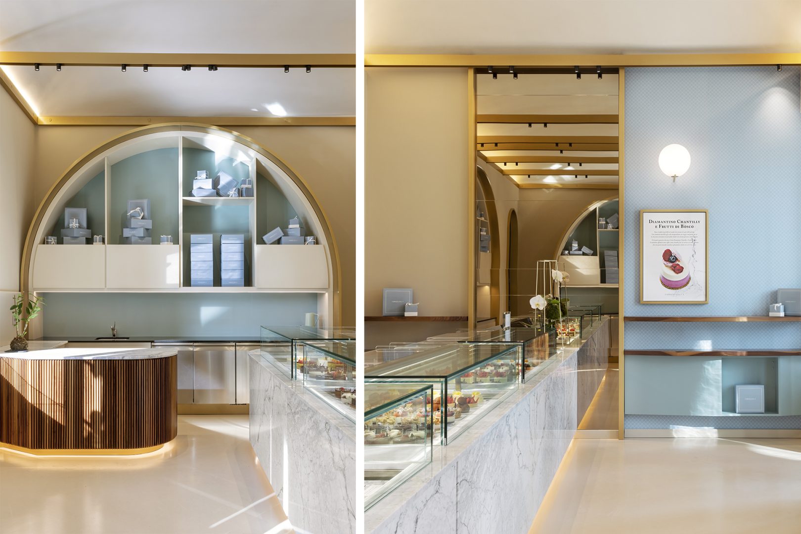 La scelta dei materiali e delle tonalità rispecchia l’immaginario della pasticceria: un pavimento in resina color crema si sposa perfettamente con i banconi e le superfici in marmo bianco di Carrara e legno di Noce Canaletto, con dettagli in bacchettato sulle parti curve.