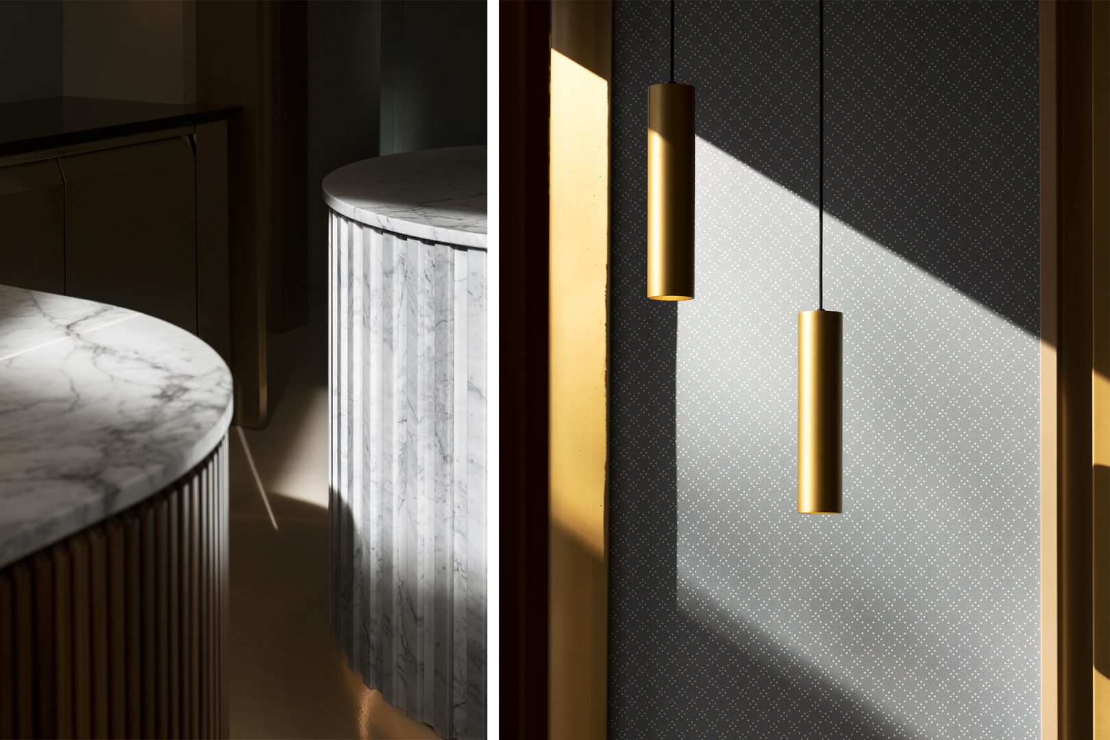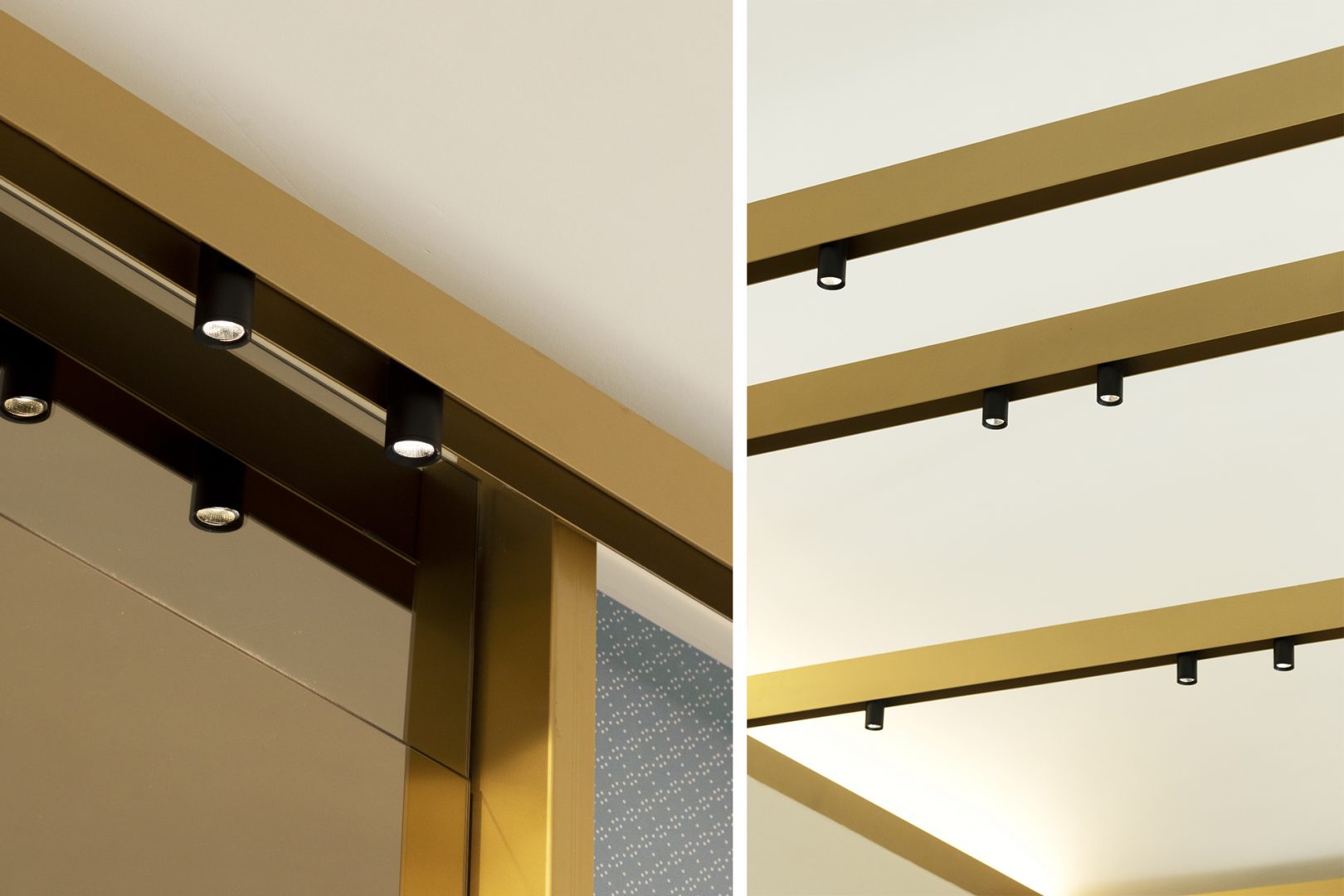 Il sistema di illuminazione riflette la luce sui dettagli in ottone dei grandi archi creando un equilibrio con il ton sur ton della texture delle pareti e delle superfici laccate.