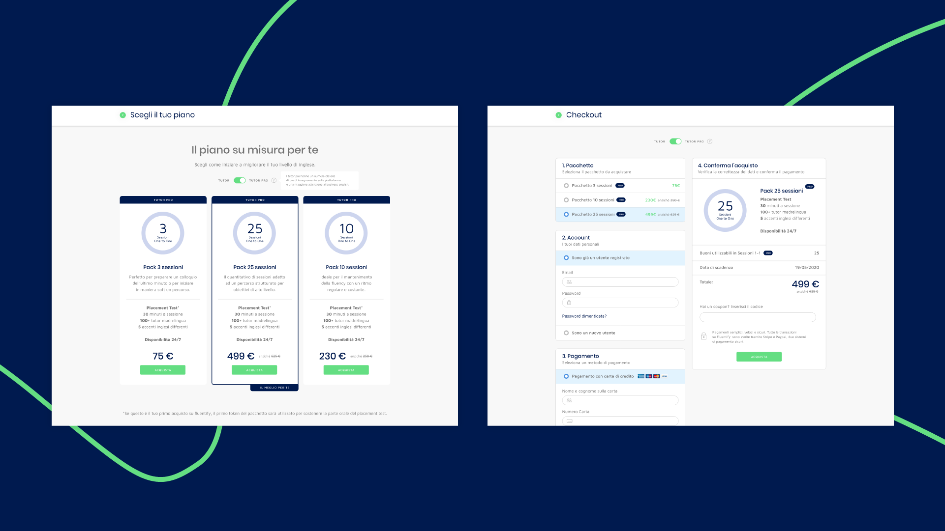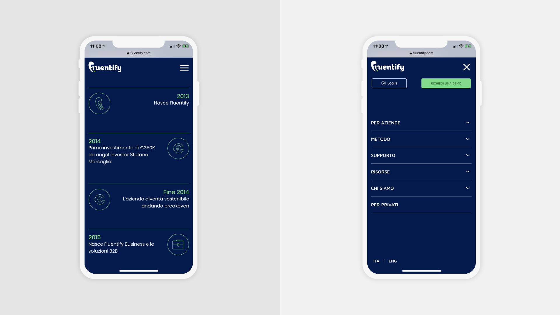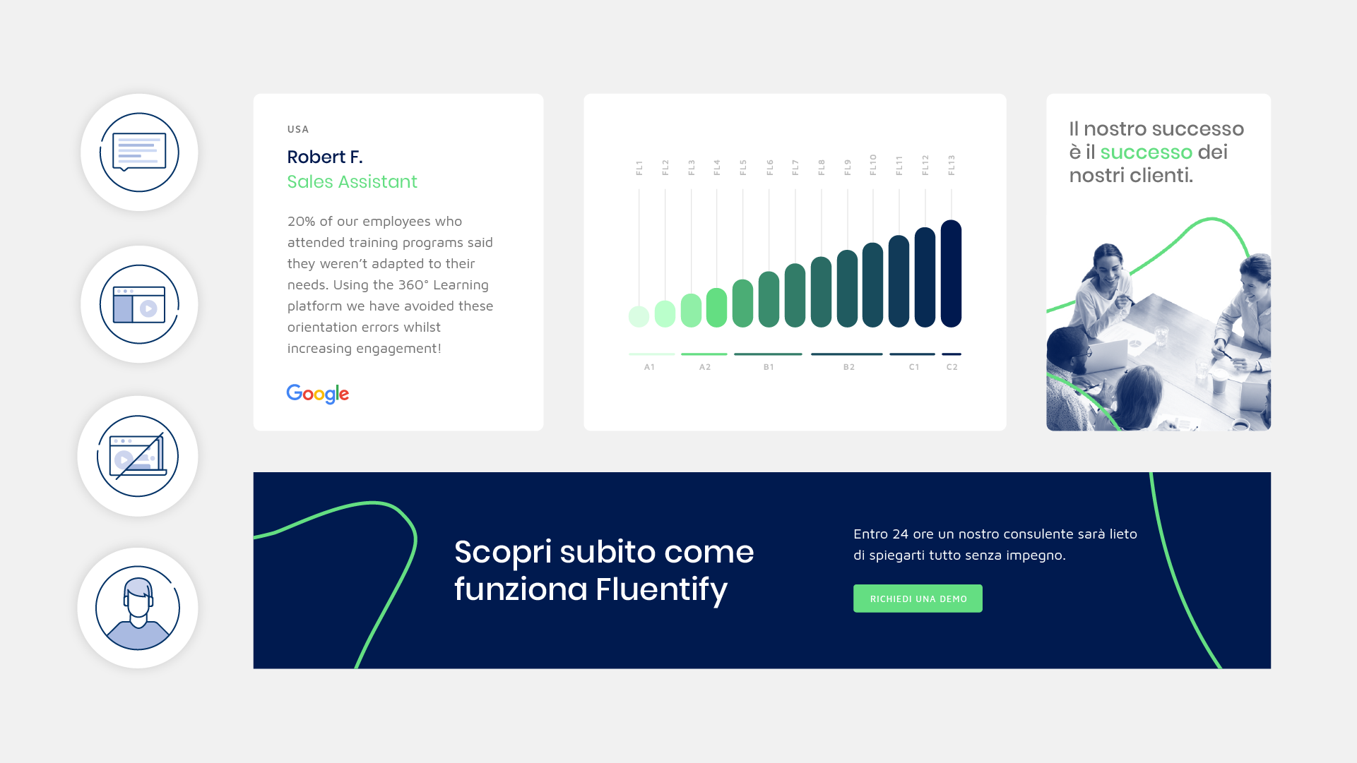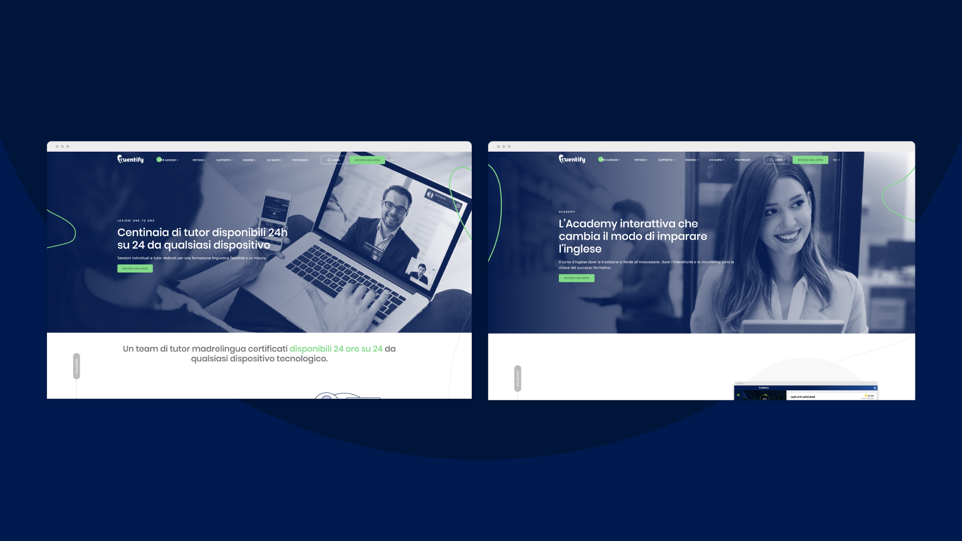Abbiamo reso coerente il visual del sito con la forte identità visiva di Fluentify, attraverso la creazione di icone personalizzate e fotografie. Le immagini contestualizzate nell’ambiente di lavoro o a casa, riescono a mostrare all’utente, in modo immediato, chi è il target del servizio: singoli e aziende.