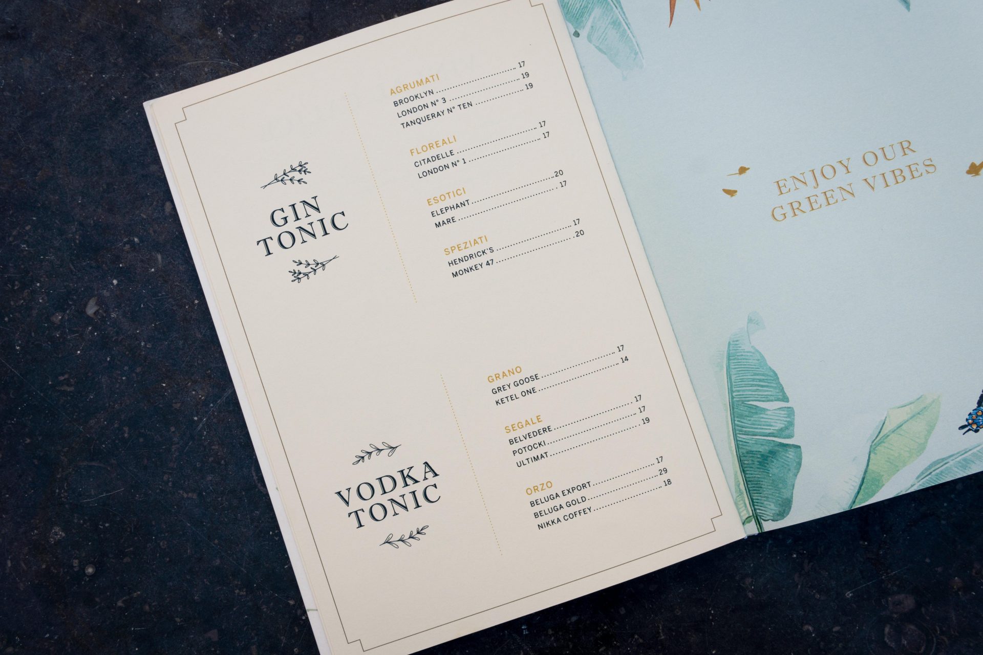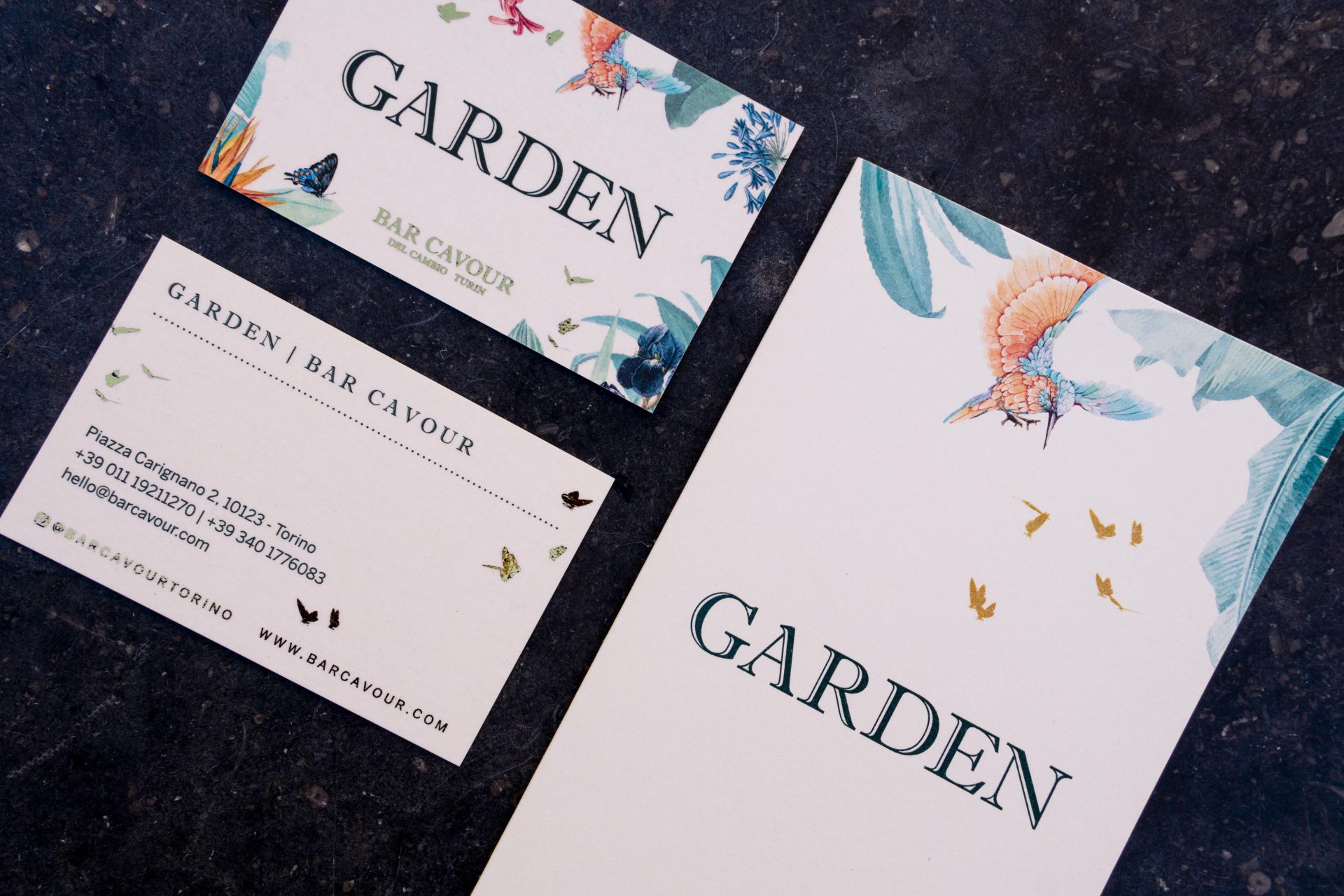 L’impaginazione semplice, ma allo stesso tempo elegante, lascia emergere la natura come protagonista attraverso vistose illustrazioni che caratterizzano il menù e gli altri supporti. I dettagli in foglia d’oro, raffinati ed eleganti, accompagnano la tipografia e le illustrazioni.