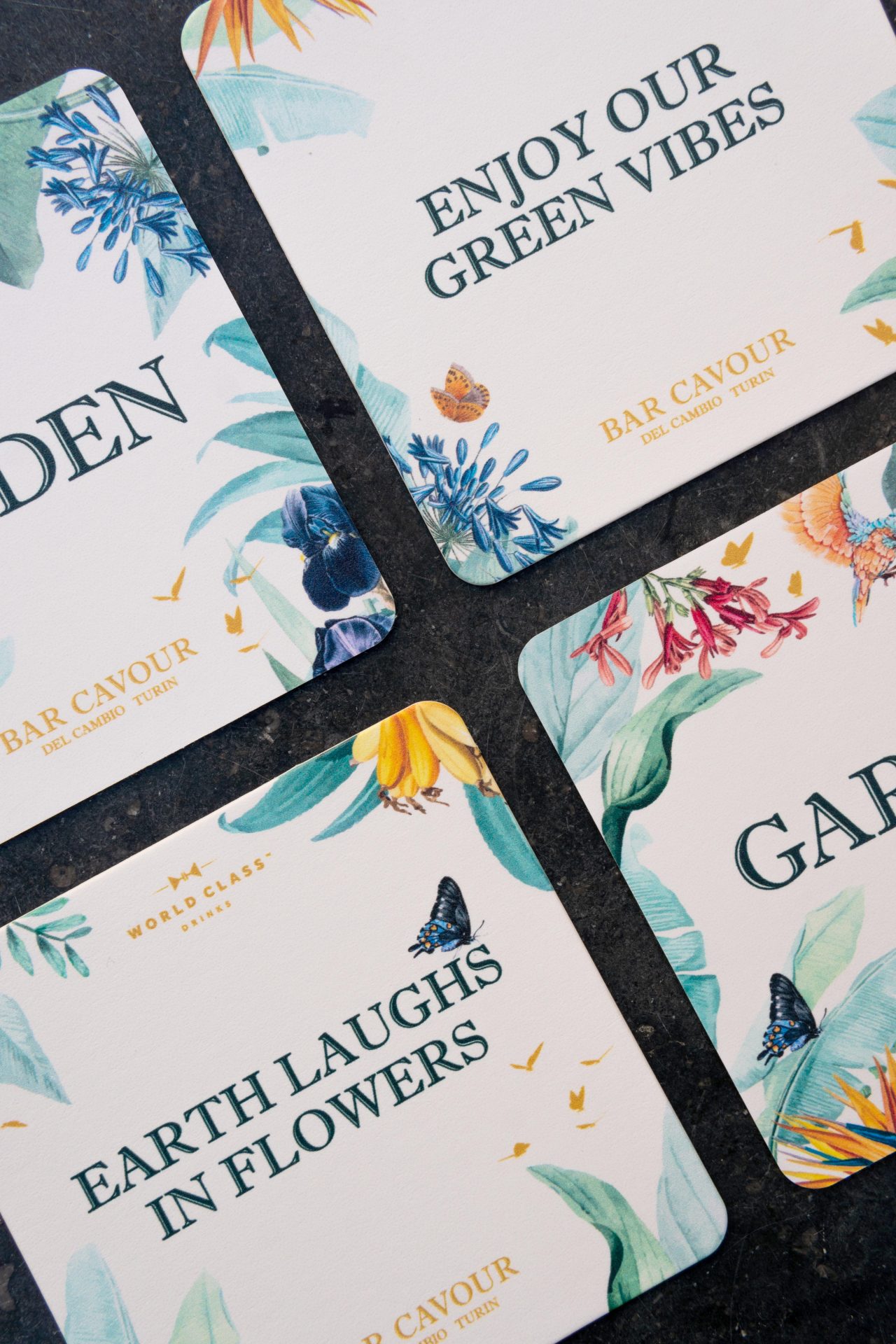 Il menù è ispirato infatti alla magia e alla natura, le illustrazioni invadono le pagine rendendo il progetto editoriale ricco di ispirazioni tropicali con piante e animali colorati, arricchiti da elementi dorati, distintivi dell’immagine coordinata più tradizionale di Bar Cavour.