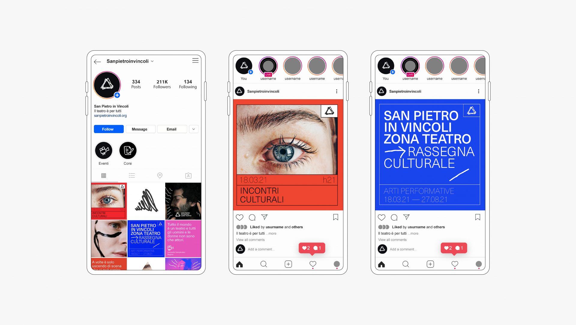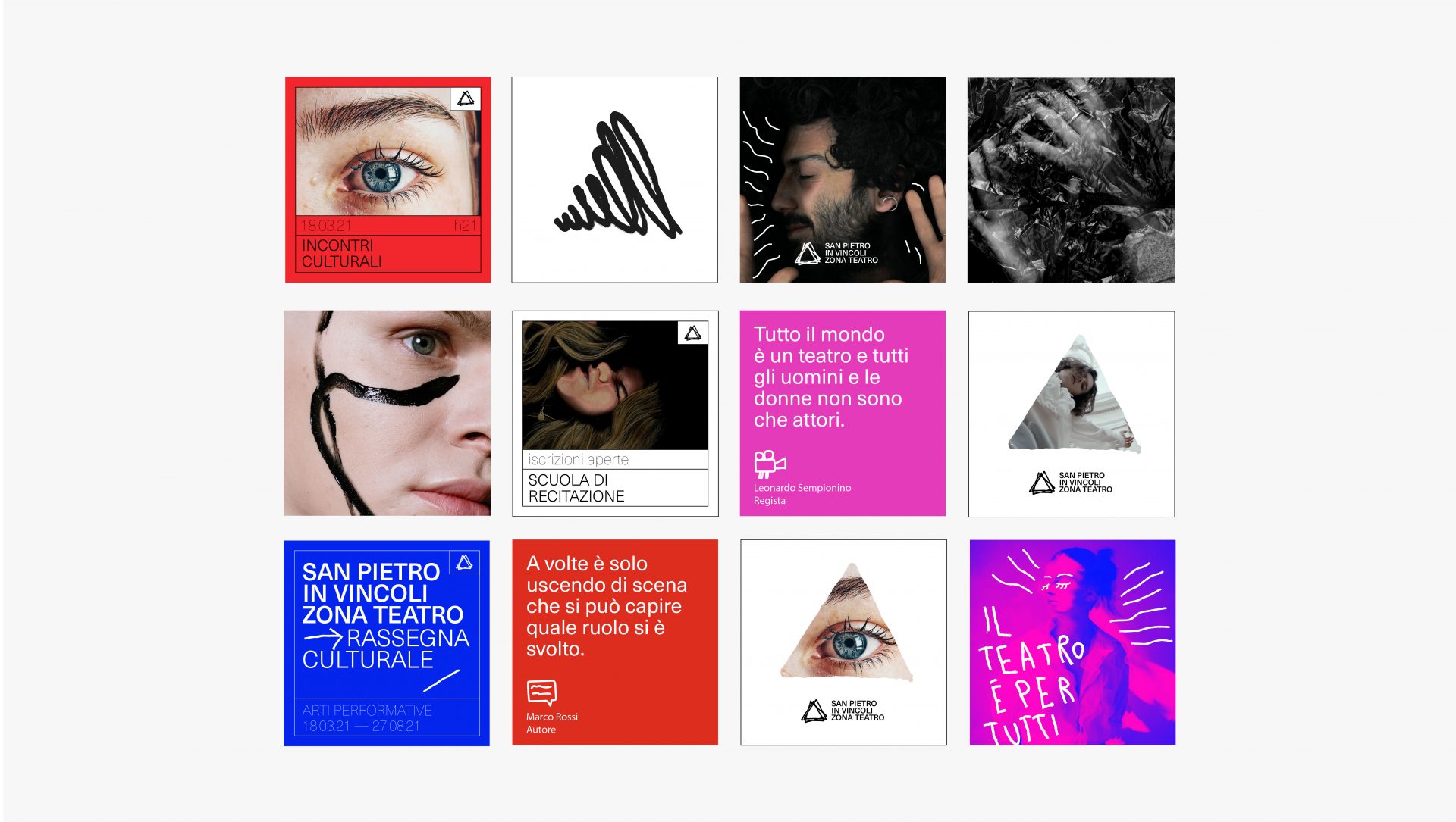 Per completare la visual identity sono stati anche realizzati dei post Instagram, che giocano sulla palette di colori scelta per rappresentare al meglio Zona Teatro, sfruttando quindi testi su sfondo piatto, foto e maschere