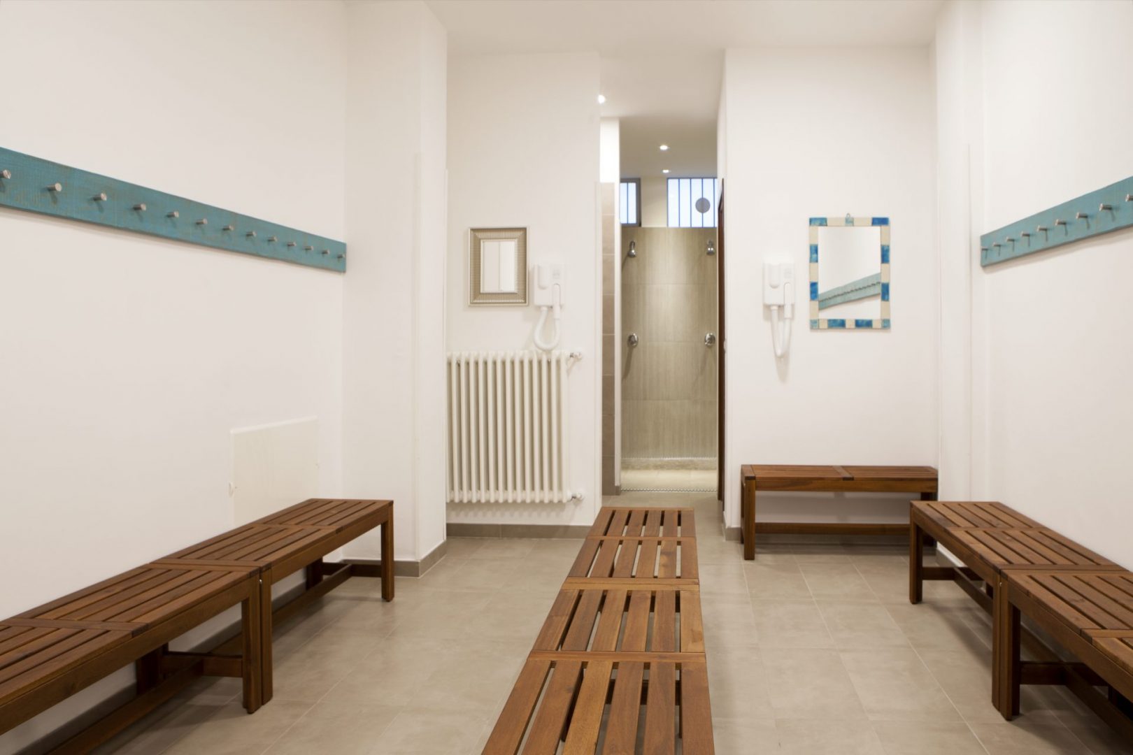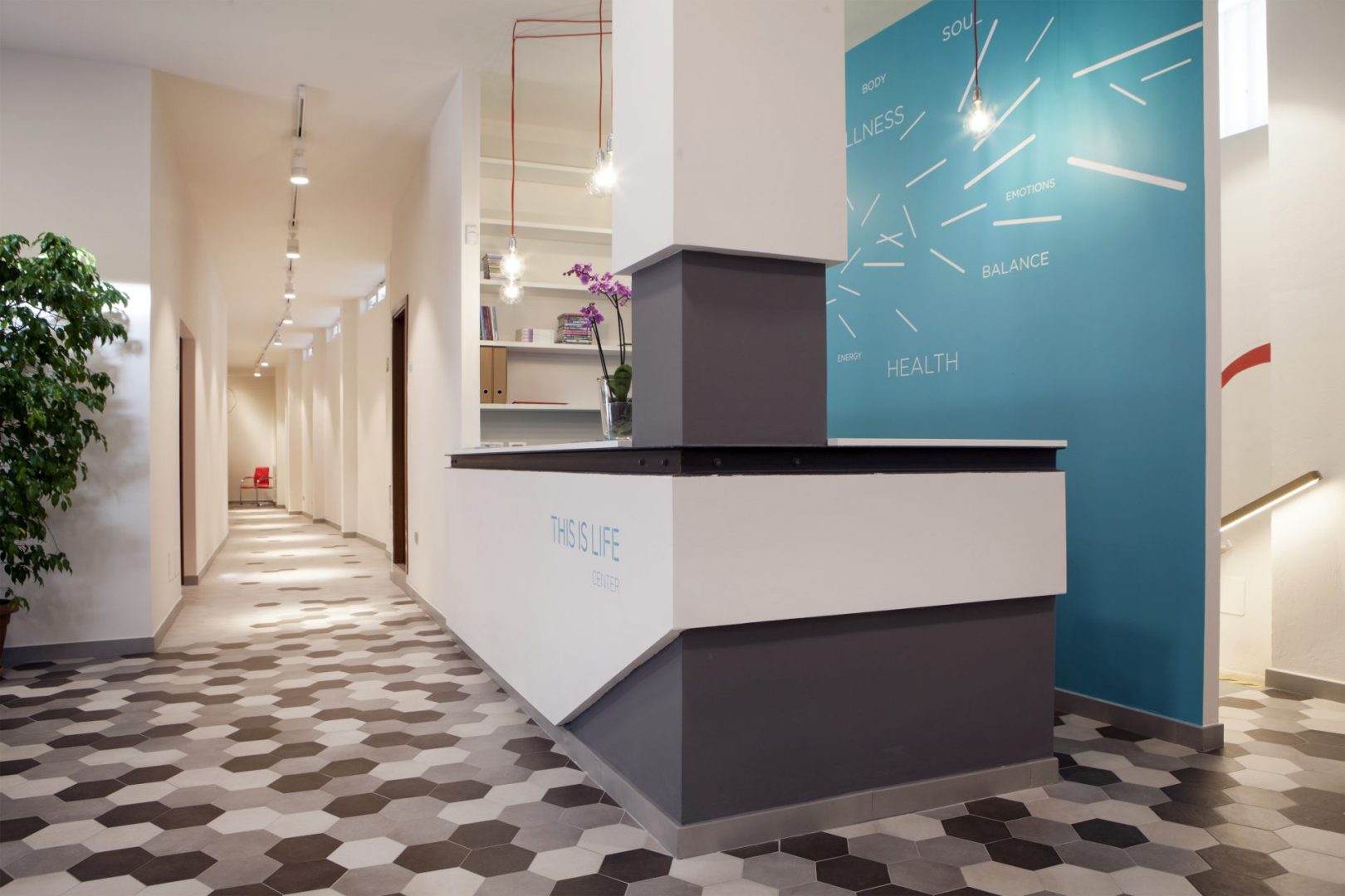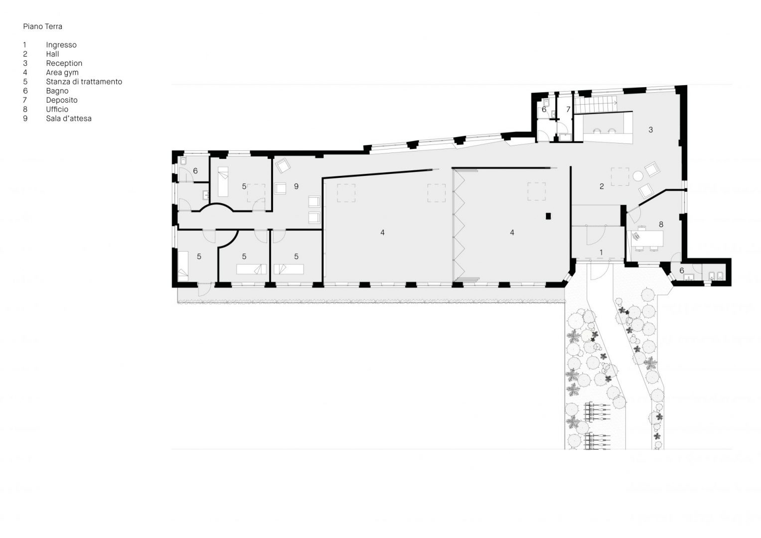 Al termine del corridoio una piccola sala d’aspetto introduce la zona dedicata alla cura della persona composta da quattro studi. Al piano interrato una seconda sala per le attività motorie ed una zona adibita a spogliatoi, servizi e locali tecnici.