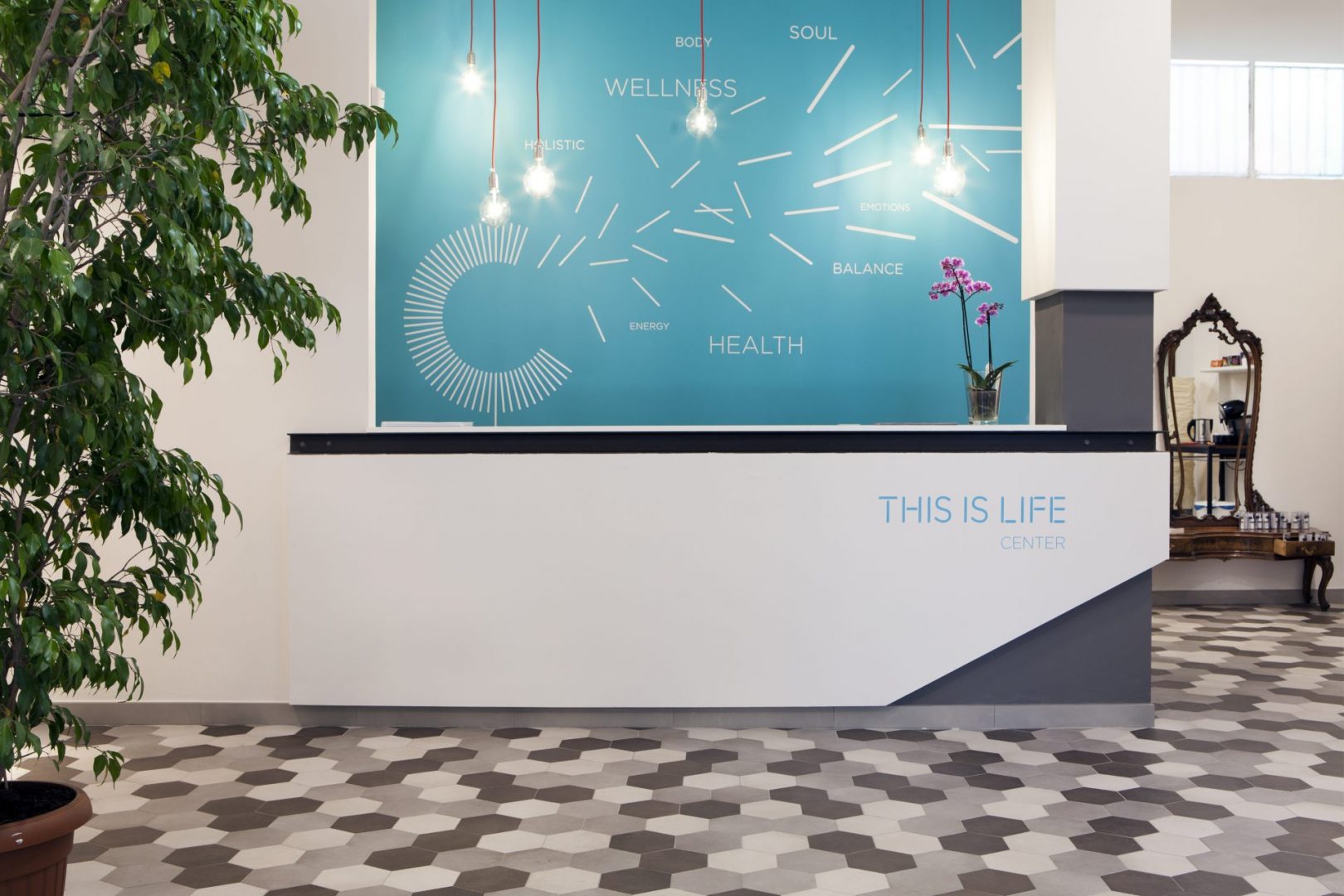 L’obiettivo del progetto è stato creare un’atmosfera rilassata e familiare in cui il cliente potesse trovare del tempo per sé stesso. Dondolarsi sulle amache antigravity, sfogarsi con gli sport da combattimento, rilassarsi con lo yoga, tonificare i propri muscoli con la pole dance o volteggiare sui cerchi. La pavimentazione a trama esagonale, sui toni del grigio, accoglie il cliente sino ad accompagnarlo alla reception.